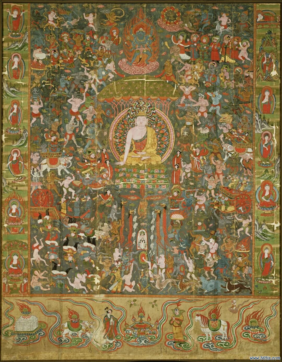 释迦牟尼在菩提树下悟道时,魔王波旬十分恐惧,派出魔子魔孙前去引诱、迫害他。但释迦牟尼始终不为所动,最终击败魔军,得以成佛。这幅绘画反映的就是这一场景。