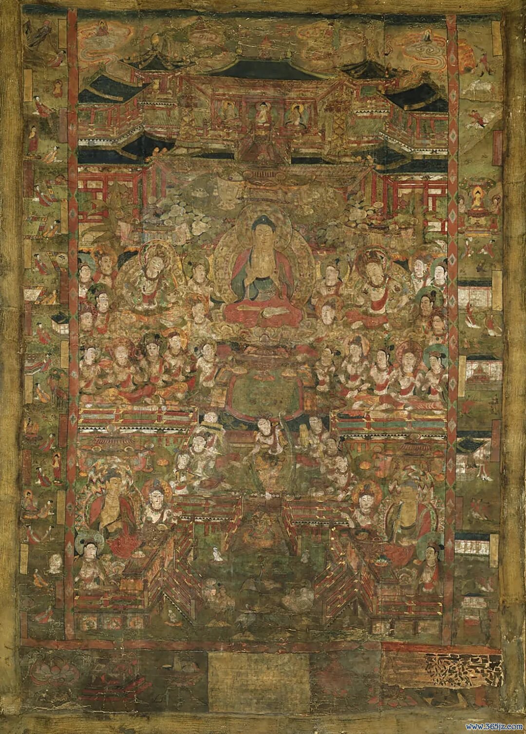 这幅绢本绘画描绘了佛教中西方极乐世界的图景。高大的楼阁则巍立于世界上方,阿弥陀佛居中,上有华盖、宝幢,旁有菩萨。下方舞乐齐奏,莲花宝池中有无数童子往生而来。整个画面色彩斑斓,想象力丰富,是盛唐时代的作品,与多幅敦煌壁画风格相似。