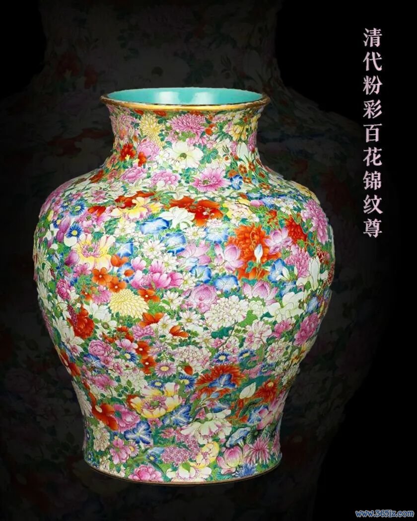 菊花、牡丹、百合、牵牛花、蔷薇、莲花、玉兰、海棠花、山茶花遍布器物,可谓“百花不露地”。这种叫做“百花锦”风格,其实是巴洛克风格西风东渐的结果。