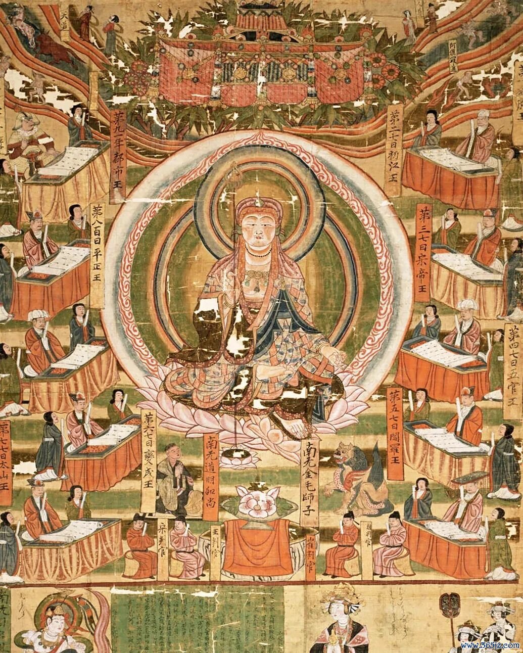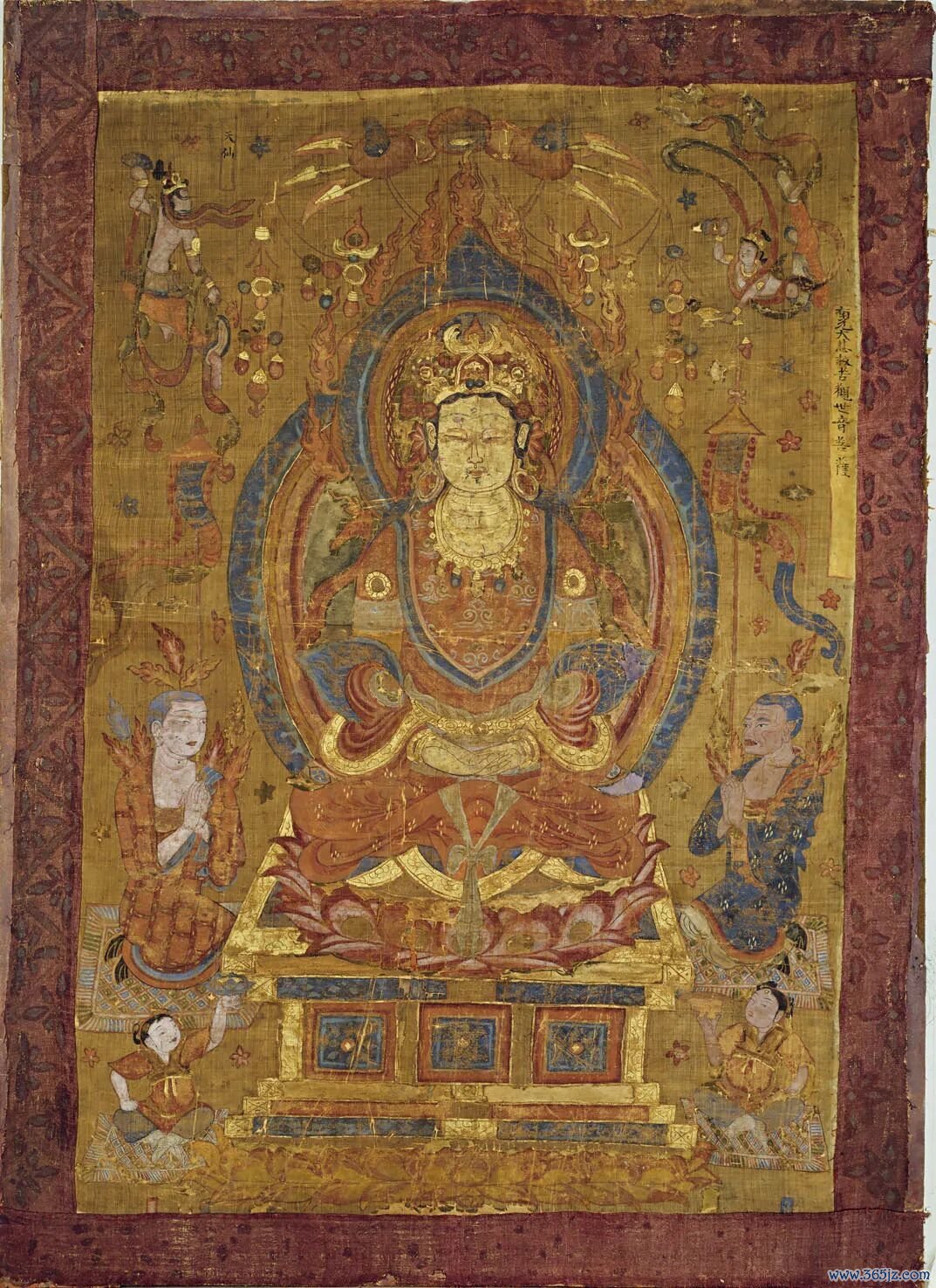这同样是一幅色彩绚丽的绢本绘画。菩萨端坐在莲台上,周身的冠饰、服饰、璎珞、背光线条流畅、色彩繁复,部分还贴有金箔。两侧有信徒、童子,上方有飞天。
