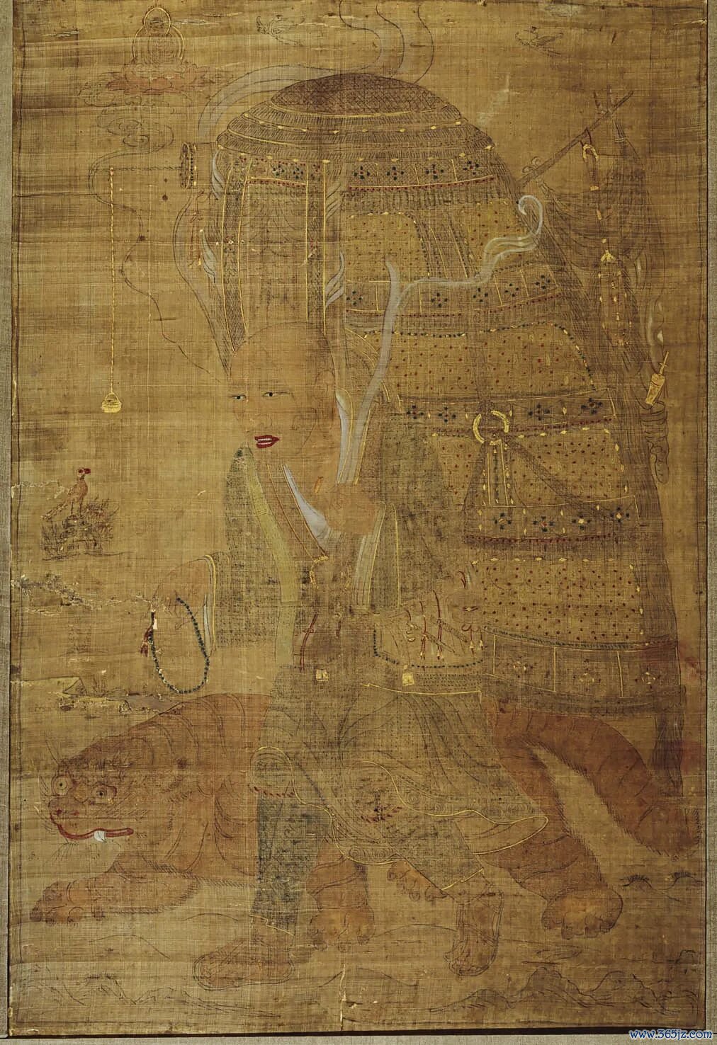 这幅绢画描绘了一位赤足、携虎、背负经箧的僧人取经归来。体现了丝绸之路上的佛教传播,可能是玄奘取经故事的视觉化呈现。