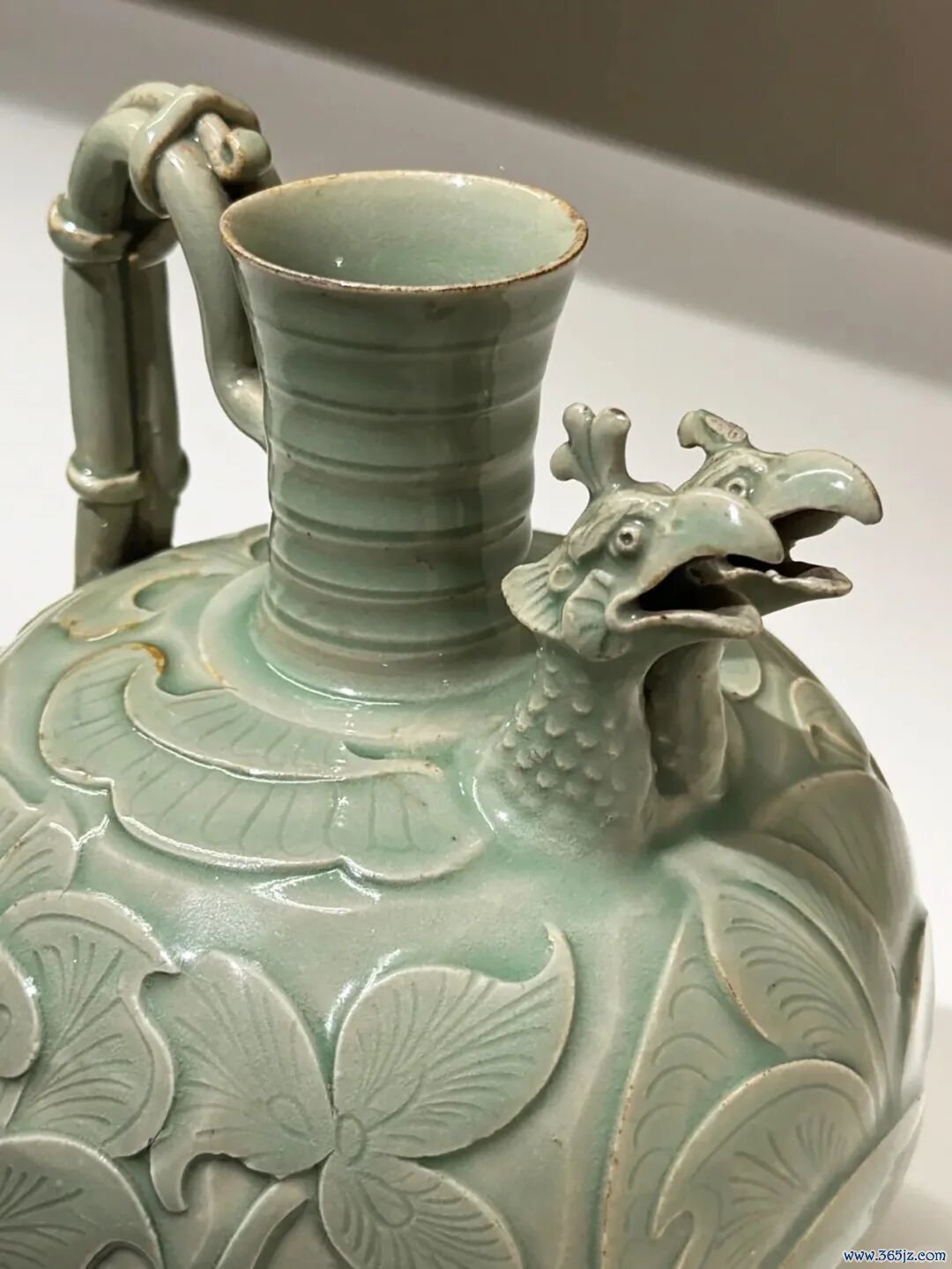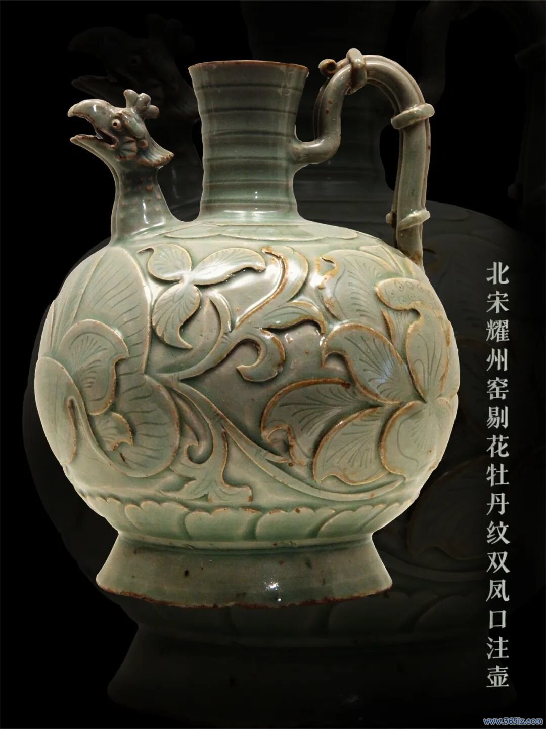釉质青润,壶身雕刻缠枝牡丹纹,开花大叶,蓬勃饱满,尚存唐代遗风。造型优美协调,以壶嘴为凤头,竹节装凤尾壶执,壶腹围牡丹纹,将“凤穿牡丹”的寓意表达得淋漓尽致。
