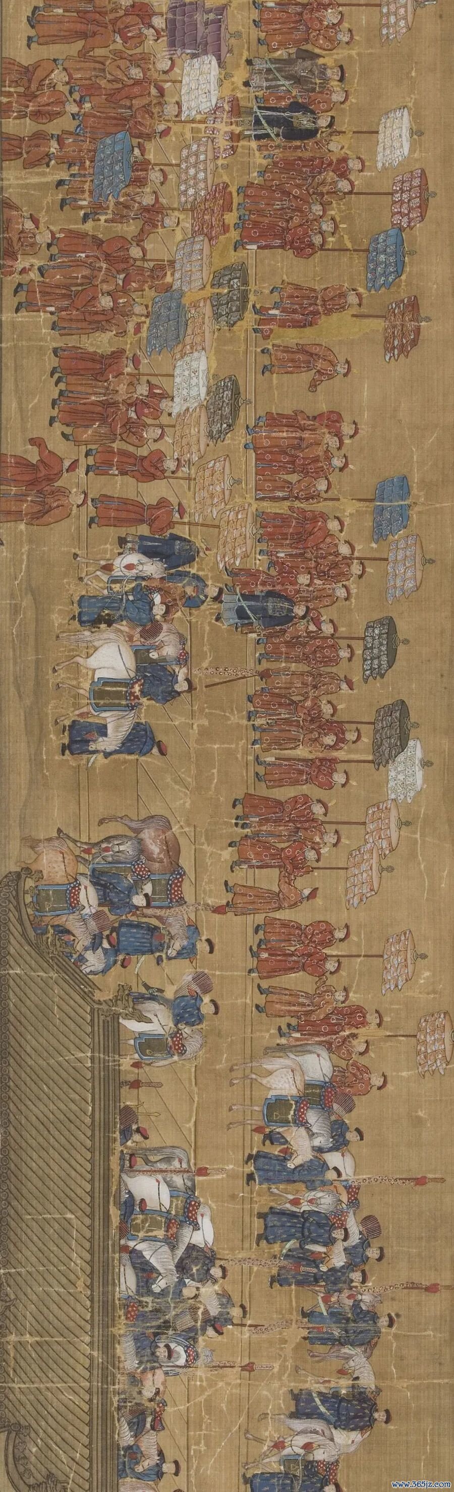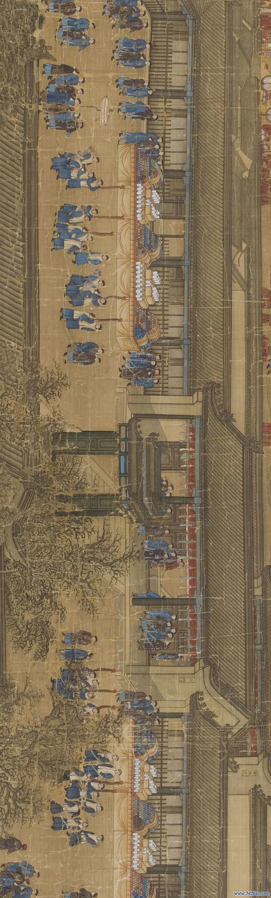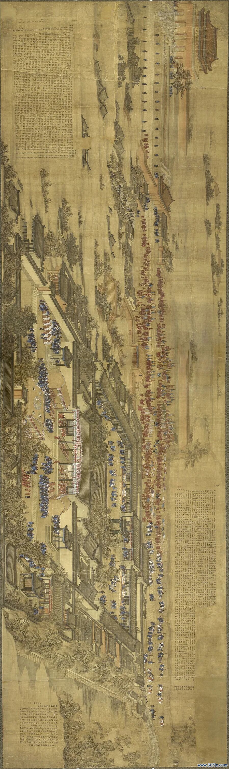 然而,一幅6米宽、两米高的巨幅画作再现了翰林院的全貌。1744年,乾隆皇帝在翰林院举行盛大典礼。金昆等六位宫廷画师再现了典礼的盛况。厉宗万等三位官员在画作的空白部分题写诗文。
