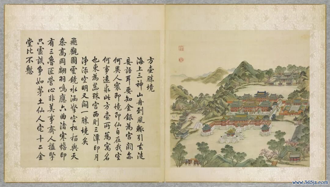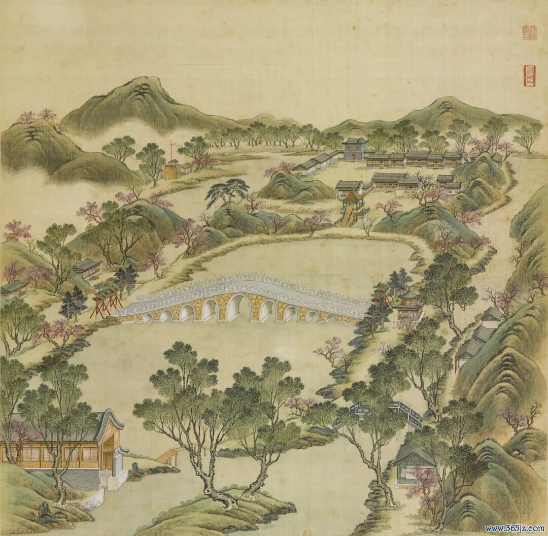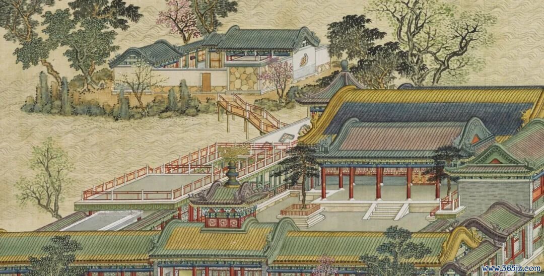 这部画册是1744年乾隆皇帝命宫廷画师唐岱等绘制的。左侧是工部尚书汪由敦书写的乾隆御制诗,右侧是工笔绘画,就连梁上的彩绘,都纤毫毕现。
