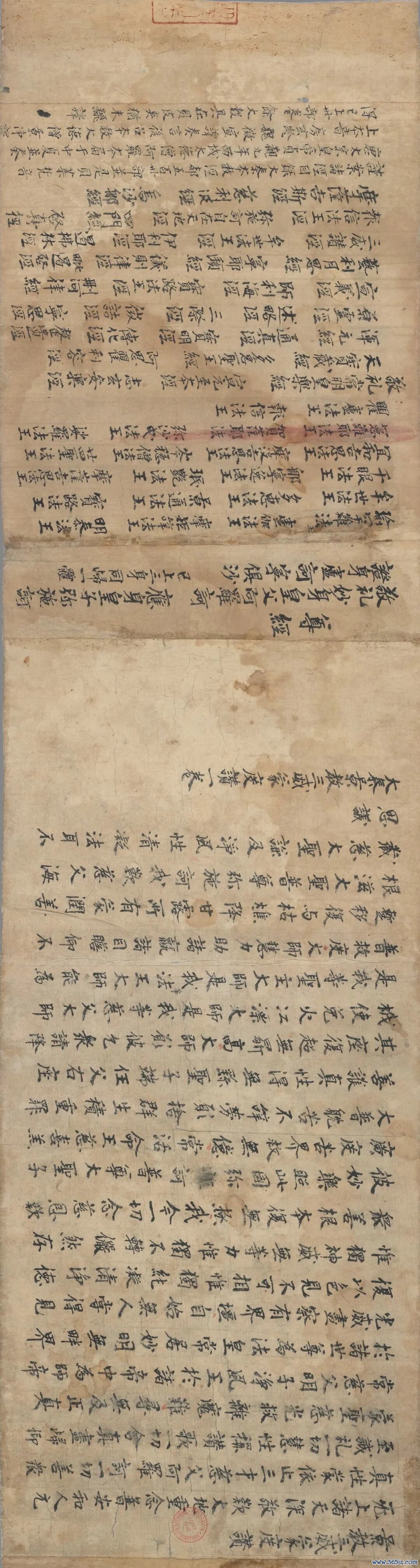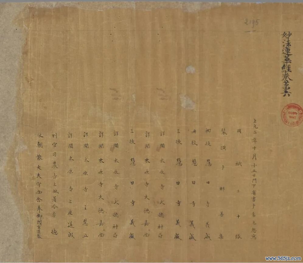 这件《妙法莲华经》就是如此。虽然卷首残缺(敦煌文献大都如此),卷尾落款却注明了书写于唐肃宗上元二年(761年)十月十五日。书写人是门下省的袁元悊,还经过了众多高僧的初校、二校、三校、详阅,以及相关官员监制,经过装潢后,才算成品,可谓敦煌写经中的极品。