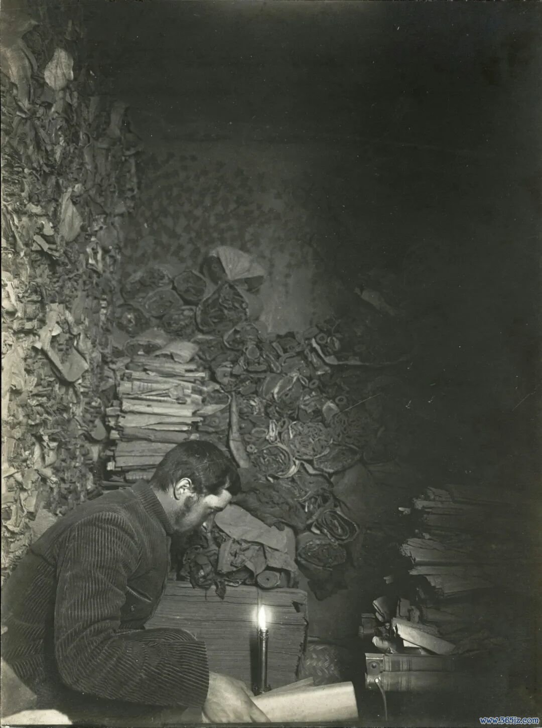 (1908年,伯希和在敦煌藏经洞内挑选文献)▼